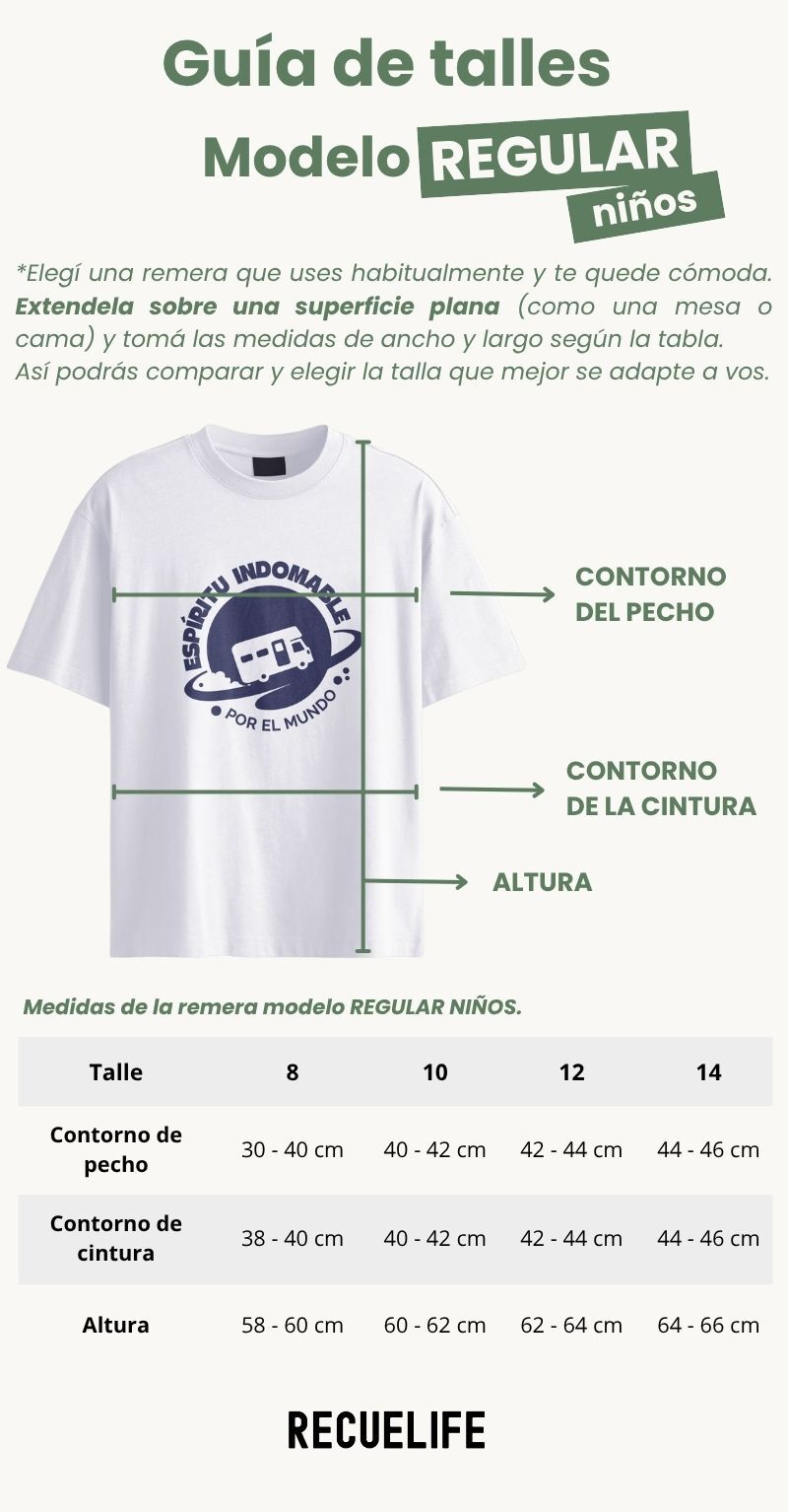 El corte REGULAR es más recto y no tan amplio. Dentro de este corte tenemos talle para niños/as.