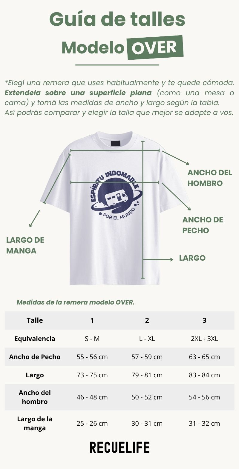 📏 ¿Cómo tomar correctamente las medidas? Elegí una remera que uses y te quede cómoda. Extendela sobre una superficie plana y usá una cinta métrica para tomar las siguientes medidas: